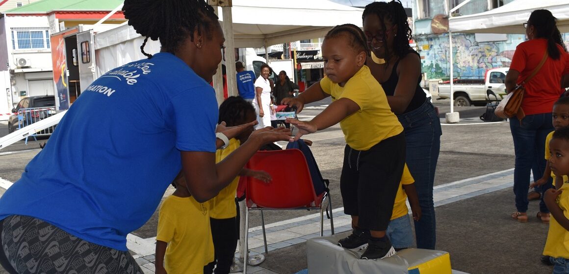Dans l'atelier du saut dans le vide, un tout-petit expérimente l'équilibre entre peur et confiance, place Gerty Archimède, Morne-à-l’Eau, semaine de la petite enfance. Photo : Ville de Morne à l'eau