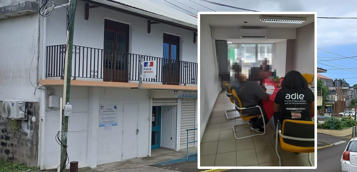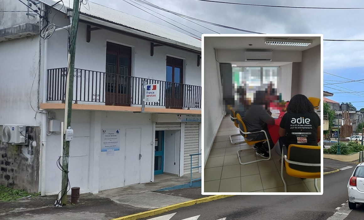 La devanture du local France services de Sainte-Rose, lieu des Cafés créateurs de l’Adie. À droite en incrustation, une session d’accompagnement qui illustre le dispositif. Photomontage LCG.