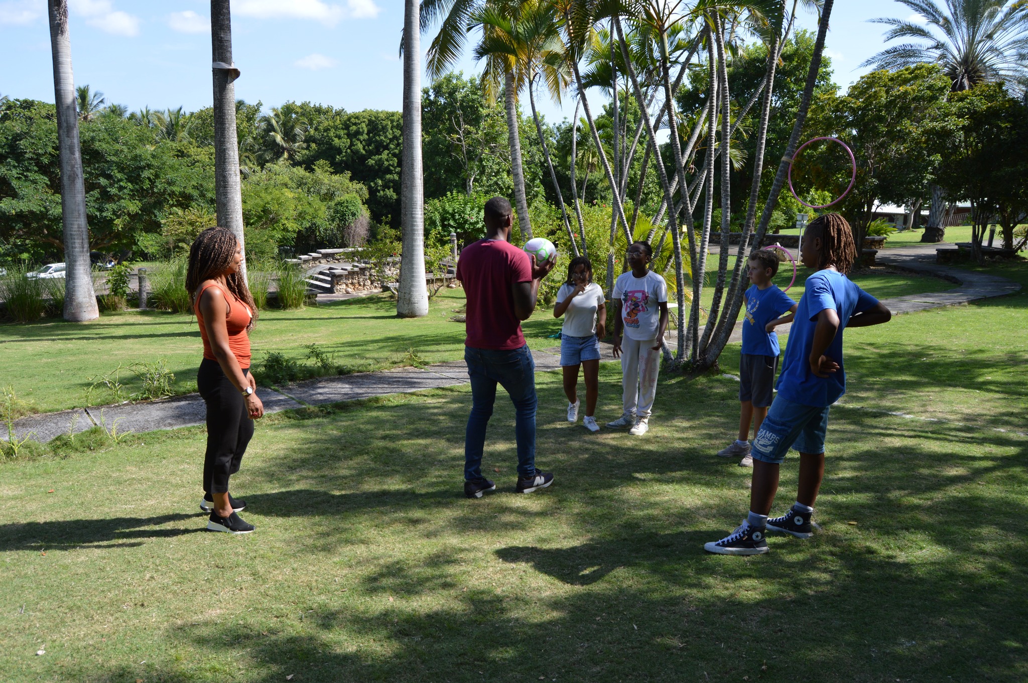 Les règles originelles, réservées à des athlètes, ont été adaptées. Dans les jardins du musée, à l’ombre des arbres géants et petits palmistes, deux équipes se renvoient la balle uniquement avec les coudes, les genoux ou les hanches, et tentent de la faire passer dans les anneaux en hauteur.
