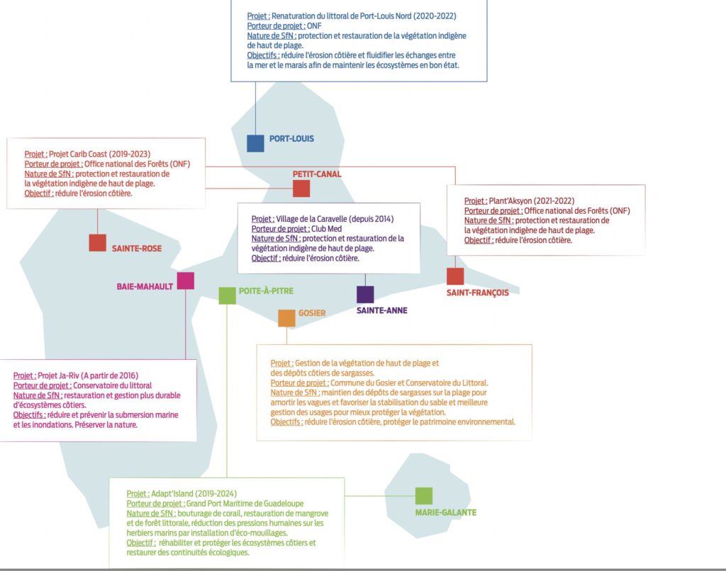 À Petit-Bourg, une centaine de familles doit être délogée et relogée. À Sainte-Anne, Pointe-Noire ou Capesterre Belle-Eau, des zones habitées sont menacées à court terme. Ailleurs dans l’archipel, certains quartiers construits en zone inondable ou marécageuse comme Belle-Plaine et Grand-Baie au Gosier ou Jarry à Baie-Mahault sont régulièrement sous l’eau. Il y a donc urgence, dans les îles, plus qu’ailleurs en France, à se préparer au changement climatique et à en limiter ses effets.