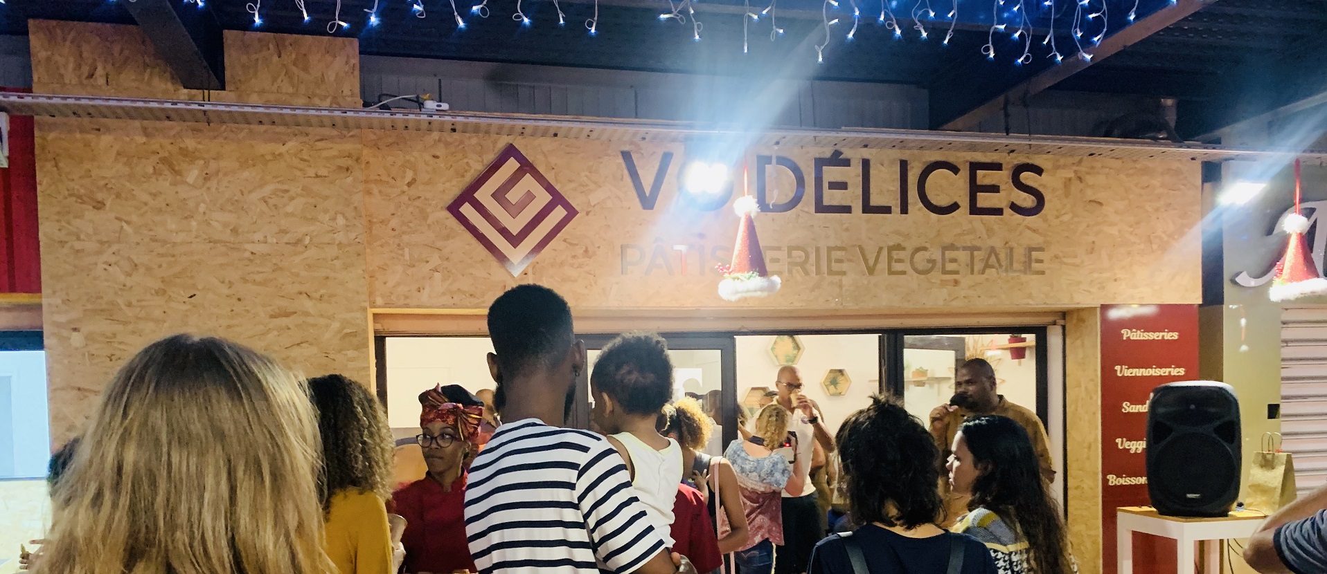17 h 43, les galeries de Houelbourg, Jarry. Une cinquantaine de personnes se tient debout devant cette toute nouvelle pâtisserie. VG Délices, un nom peu commun, mais qui prend tout son sens lorsque l’on comprend sa signification. “VG” pour “végétale”, ou encore “vegan”. Ce mardi 17 décembre, VG délices, première pâtisserie végétale de la Guadeloupe, “des Antilles même”, comme le précise Laurence, la tête pensante derrière cette idée hors du commun, a été inaugurée au cours d’une soirée privée. Au programme, dégustation de viennoiseries 100 % végétales et tirage au sort pour tenter de gagner de nombreux lots offerts par les partenaires. Après quelques minutes qui semblent interminables, les convives sont invités à pénétrer dans la pâtisserie. Sans hésitation, tout ce petit monde se précipite à l’intérieur de la boutique. En passant la porte, on découvre un décor épuré. Le bois est à l’honneur. Un immense banc occupe le fond de la pièce principale. Juste au-dessus, des plantes trônent sur des petites étagères. Une petite table haute entourée de deux chaises est installée face à la vitrine réfrigérée où ont été installées plusieurs parts de bûches gourmandes, revisitées pour l’occasion, à l’approche des fêtes de fin d’année. Sur le mur qui jouxte la porte du “labo”, où le pâtissier et la cuisinière s’affairent à la préparation de mini-gourmandises pour les invités, il est inscrit la citation : “Let’s change the world, one piece of cake at a time” (Changeons le monde, une part de gâteau à la fois, NDLR). Une phrase qui prend tout son sens lorsque l’on connaît la motivation de la propriétaire, Laurence Ognibene. “C’est délicieux, je serais incapable de faire la différence avec des pâtisseries non vegan !” s’exclame une femme, tout en engouffrant un mini-croissant dans sa bouche.