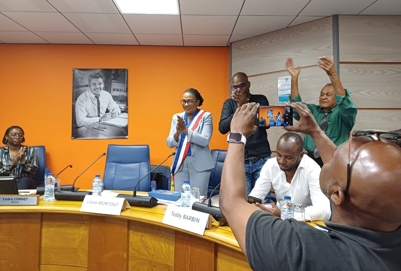 Rectificatif : Montout 17, Baclet 16. Mais le conseil municipal s’apprête à procéder à un second tour sous prétexte que dans la mesure où il y a 35 conseillers municipaux, la majorité absolue serait à 18 voix. Jusqu’à ce que la directrice générale des services, Code des collectivités locales à l’appui, rectifie. La majorité absolue se calcule sur le nombre de suffrages exprimés. Il y en a eu 33. La majorité absolue est 16,5. Liliane Montout est élue. Sous les applaudissements nourris l’écharpe de maire est passée à son cou. Liliane Montout devient la première femme maire du Gosier. Dans son discours de remerciement la cheffe d’édilité annonce la couleur : elle veut restaurer la probité et la démocratie.